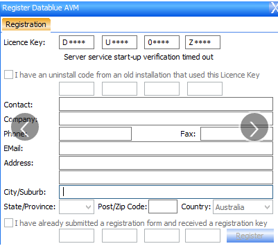 When trying to register AVM for Office and you receive a “Server service start-up verification timed out” error (as seen below).